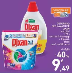 Non perdere l'opportunità di risparmiare ed approfittare delle migliori offerte Dixan presenti nei cataloghi e volantini di questa settimana. Resta aggiornato sulle ultime promozioni!